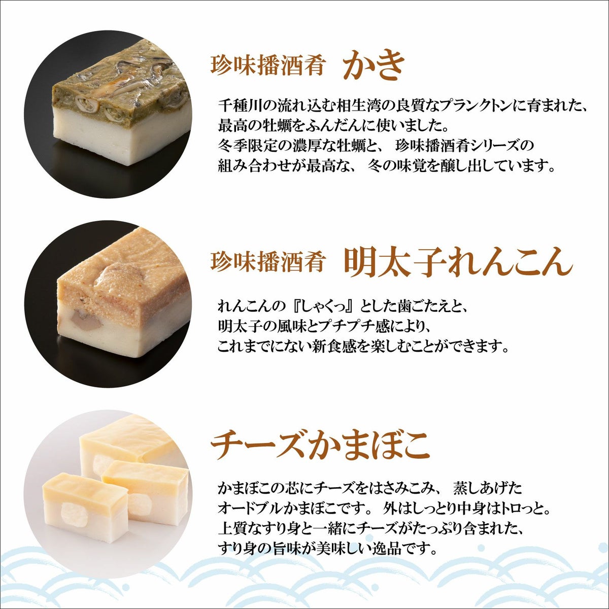 他の画像を見る 冬季限定の珍味播酒肴『かき』を含めた、お正月おススメの珍味かまぼこセット 珍味播酒肴『かき・明太子れんこん』とチーズかまぼこのセット (化粧箱3本入り)【真空商品】 冬のギフトに最適 お正月に最適 期間限定 クール便でお届け 人気商品 価格 ¥ 4,326 税込 販売を終了しました。 冬季限定の『珍味播酒肴ちんみばんしゅこう・かき』を含む、年末年始のご挨拶やお正月の食卓におススメの、オードブルかまぼこ3本のセットです。 詳細を見る お気に入りに登録する