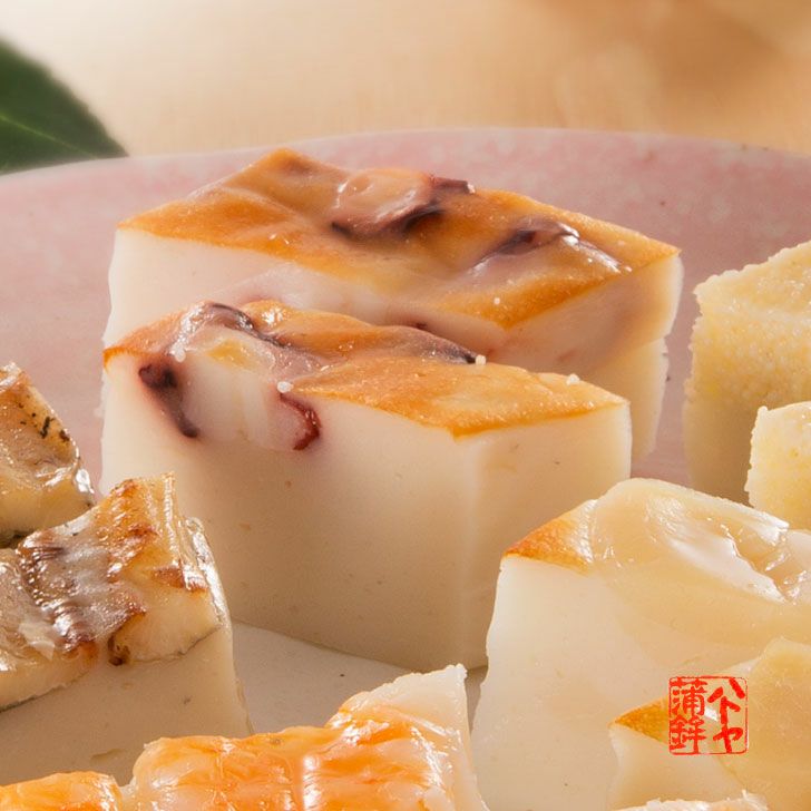 厳選された「白ぐち」、「いとより」、「はも」、 「すけそうだら」を配合したすり身の旨味の中に、瀬戸内・播磨灘名物の「明石たこ」を練りこみ、さらに箱寿司のように乗せて蒸しあげました。